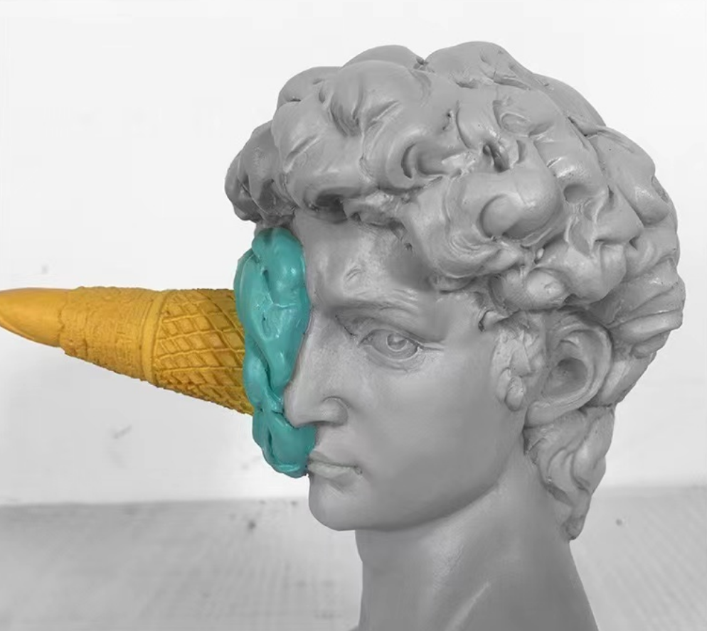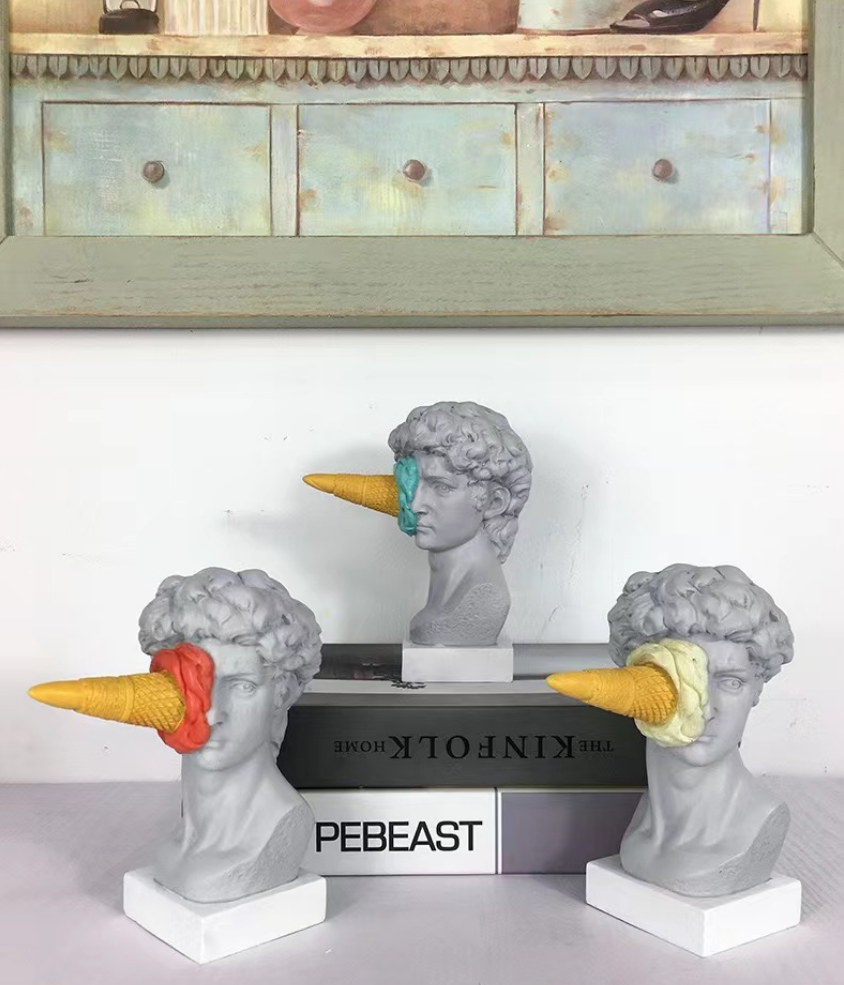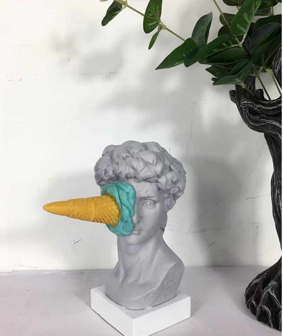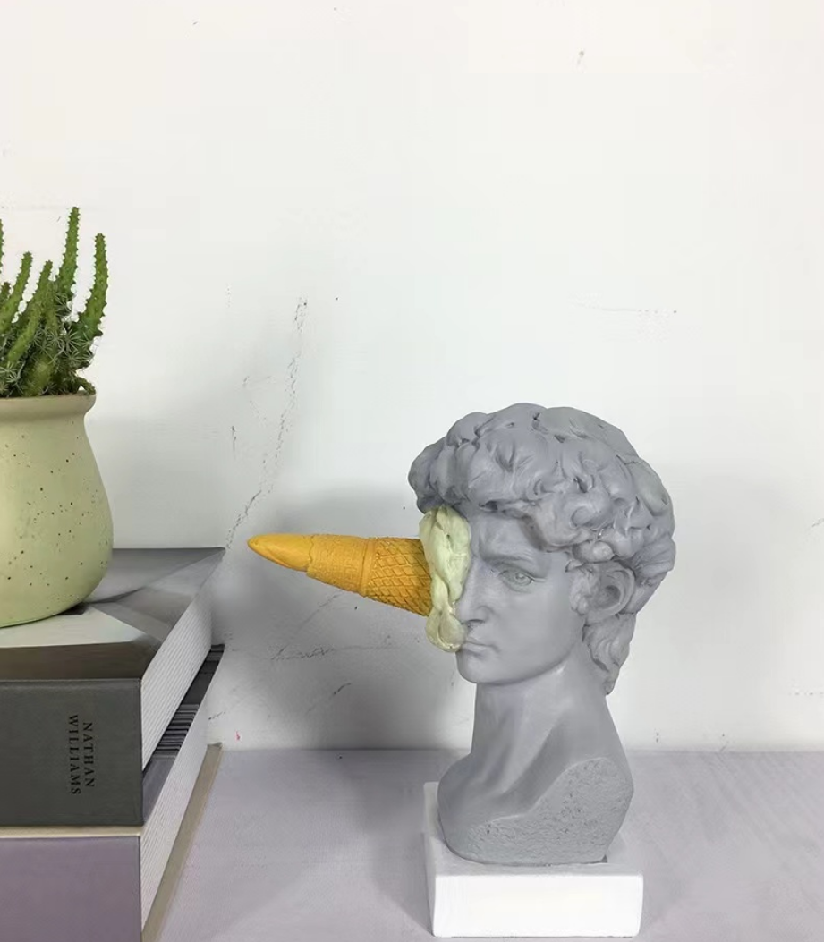 Add bold personality to your space with this eye-catching David meets dessert sculpture — where classical art gets a cheeky modern twist. Featuring a replica of Michelangelo’s David with a turquoise ice cream cone dramatically splattered across his face, this piece is perfect for those who love to mix high culture with pop humor.