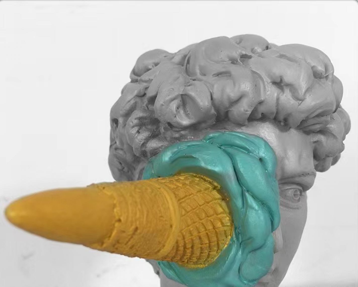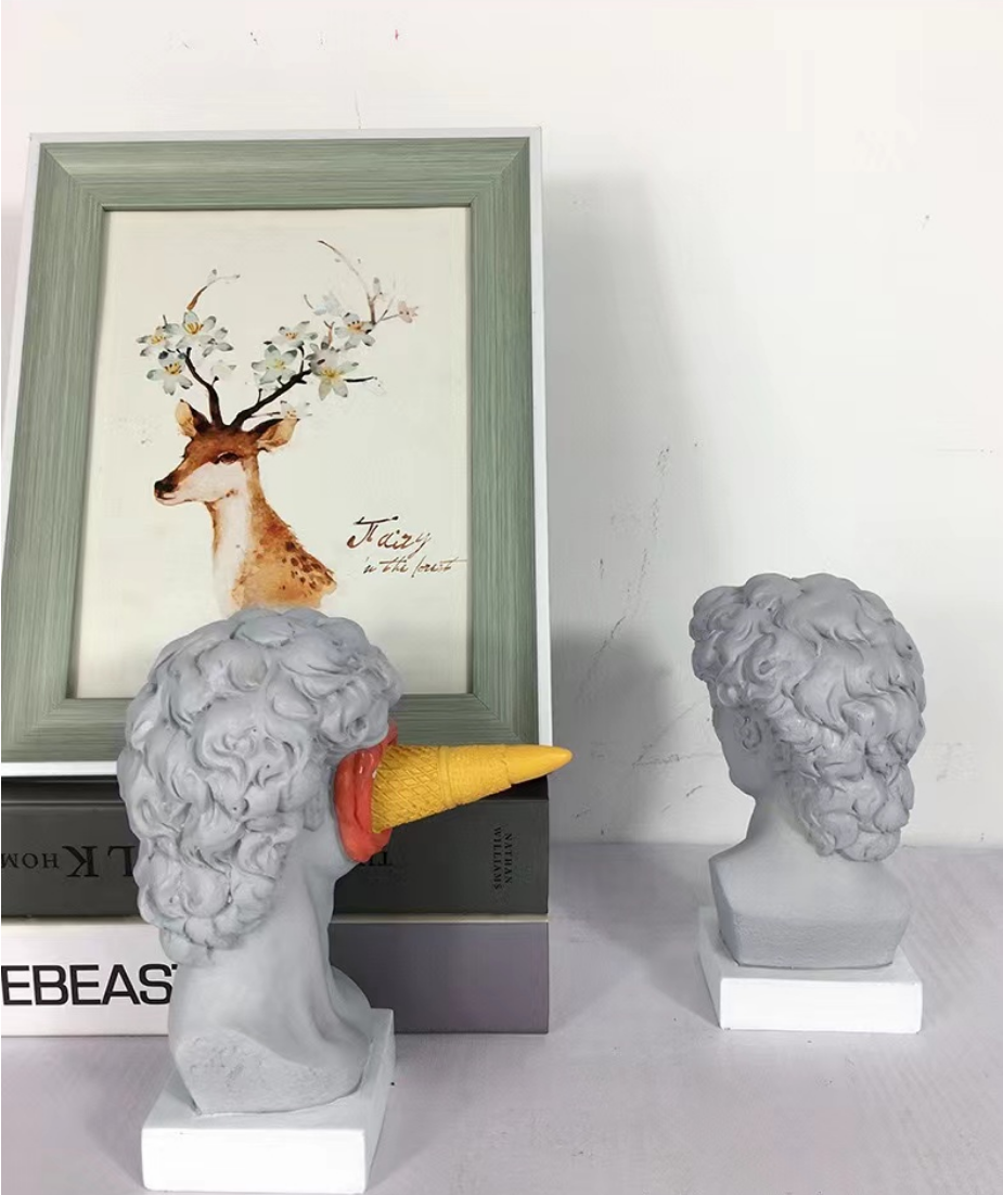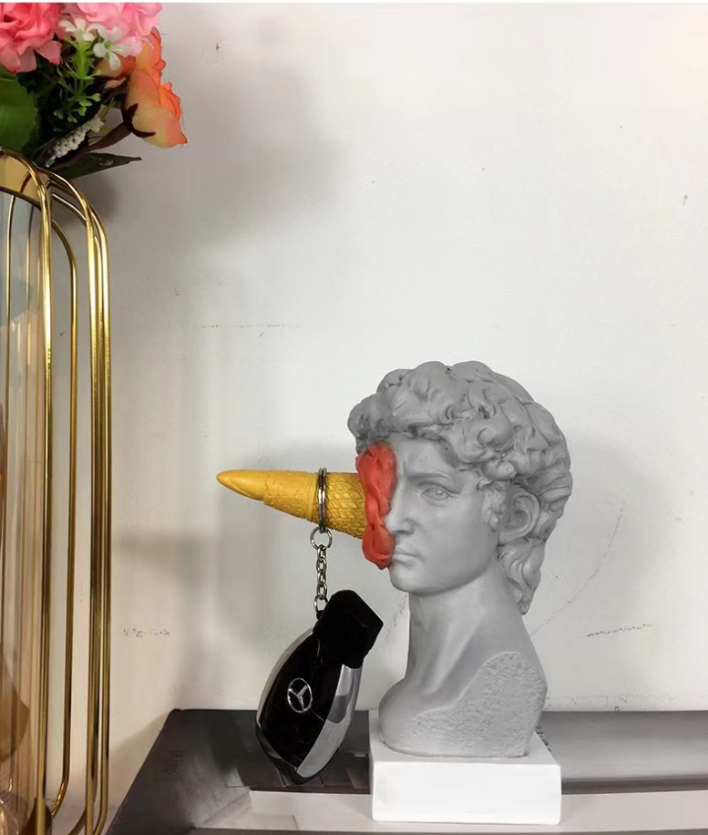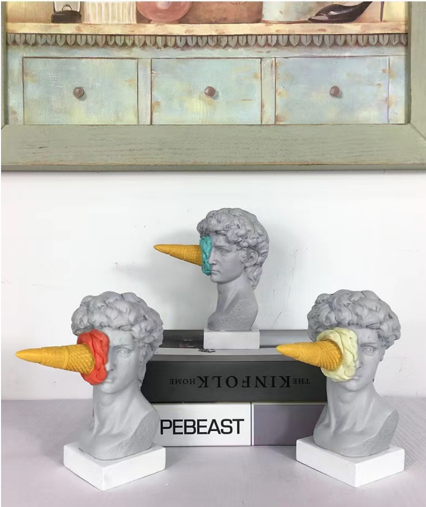 Add bold personality to your space with this eye-catching David meets dessert sculpture — where classical art gets a cheeky modern twist. Featuring a replica of Michelangelo’s David with a turquoise ice cream cone dramatically splattered across his face, this piece is perfect for those who love to mix high culture with pop humor.