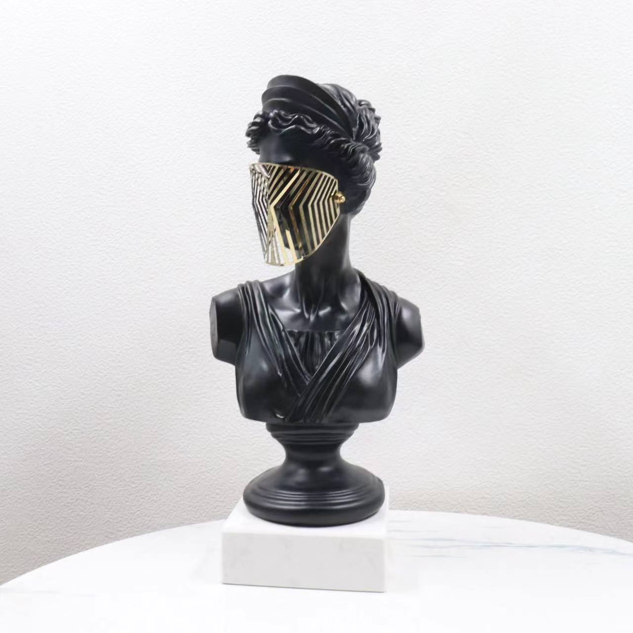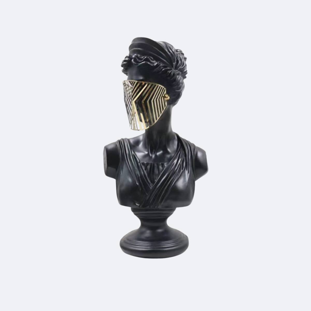Commanding and enigmatic, Shadow Athena redefines classical art with a bold, futuristic twist. This striking black bust, inspired by Greco-Roman goddess figures, is cloaked in smooth matte detail and crowned with a gold geometric visor that radiates power and intrigue. Mounted on a sleek white marble base, the contrast in textures and tones adds modern luxury to your space. Whether showcased as a centerpiece or part of an artful shelf arrangement, Shadow Athena is more than décor — it’s a statement of strength, mystery, and contemporary elegance. Perfect for collectors, creatives, or anyone curating a space with depth and edge.